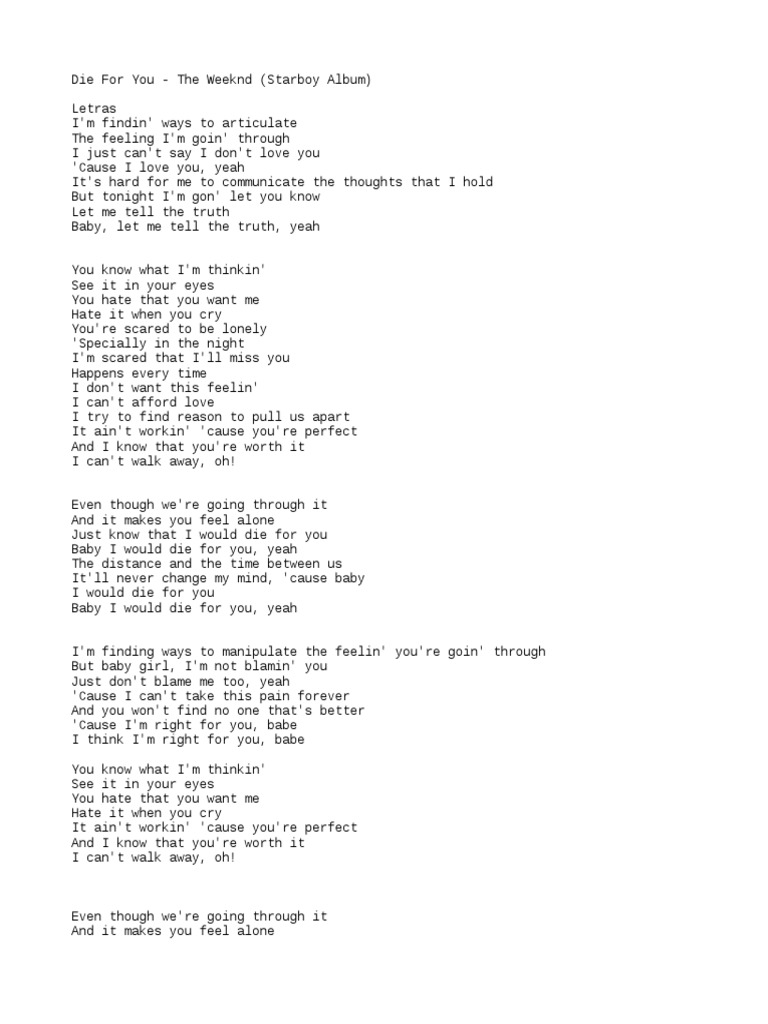 Verse 2 Im finding ways to. If it makes you feel alone. Die for You is a song by Canadian singer The Weeknd from his third studio album Starboy 2016.